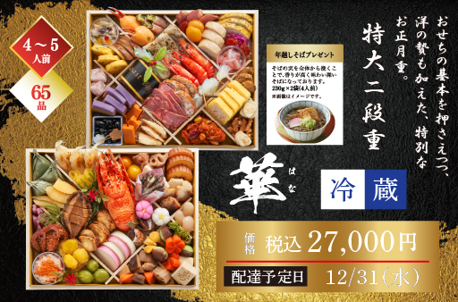 匠選おせち 華(はな) X Facebook はてブ Pocket LINE コピー 2025.09.26 匠選おせち 華冷蔵配送 全65品おせちの基本を押さえつつ、洋の贄を加えた、特別なお正月重特大2段重12月31日配達予定※配達時間のご指定はできません。